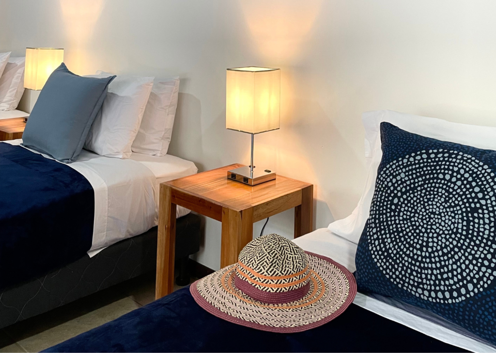 Guest rooms are nestled within a collection of charming single and two-story villas. Each space is designed for comfort and convenience, featuring generous storage, USB charging ports, air conditioning, and high-powered fans.